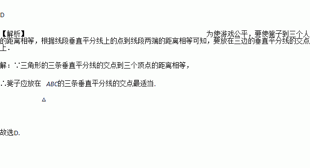 在元旦联欢晚会上,有A、B、C三名同学站在一个三角形的三个顶点上,他们在玩抢凳子游戏,要求在他们中间放一个木凳,谁先抢到凳子谁获胜,为游戏公平,则凳子应放的最适当的位置是△ABC的( )