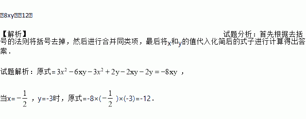 先化简,再求值:3x(x﹣2y)﹣[3x2﹣2y+2(xy+y)],其中x=﹣,y=﹣3.