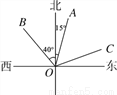如图,OA的方向是北偏东15°,OB的方向是北偏西40°,若∠AOC=∠AOB,则OC的方向是______________.
