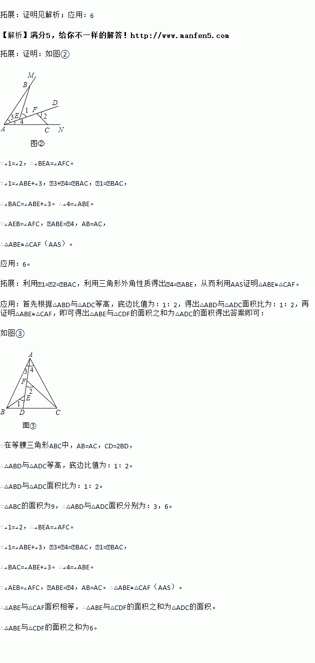 拓展:如图②,点B、C在∠MAN的边AM、AN上,点E, F在∠MAN内部的射线AD上,∠1、∠2分别是△ABE、△CAF的外角.已知AB=AC,∠1=∠2=∠BAC.求证:△ABE≌△CAF.