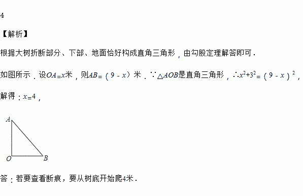 一棵9 m高的树被风折断,树顶落在离树根3 m之处,若要查看断痕,要从树底开始爬多高?