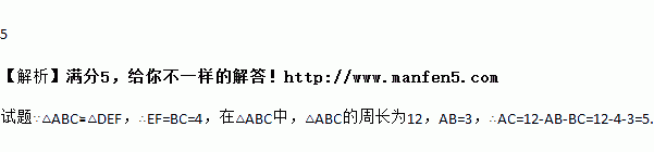 已知△ABC≌△DEF,且△ABC 的周长为 12,若 AB=3,EF=4,则 AC=_____.