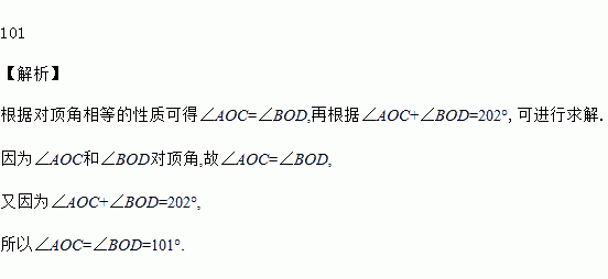 如图,直线AB和CD相交于点O,∠AOC与∠BOD的度数之和为202°,那么∠AOC的度数为_____度