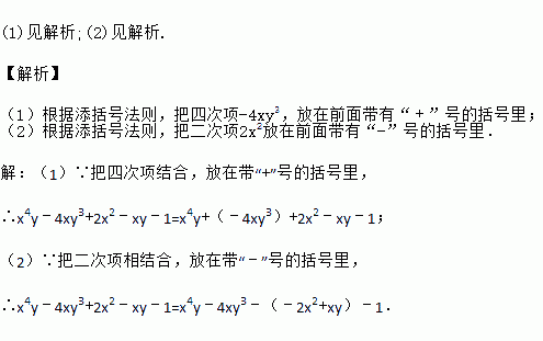 把多项式x4y﹣4xy3+2x2﹣xy﹣1按下列要求添括号: