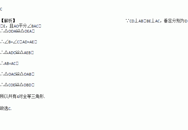 如图,已知CD⊥AB,BE⊥AC,垂足分别为D、E,BE、CD交于点O,且AO平分∠BAC,那么图中全等三角形共有的对数是( ).