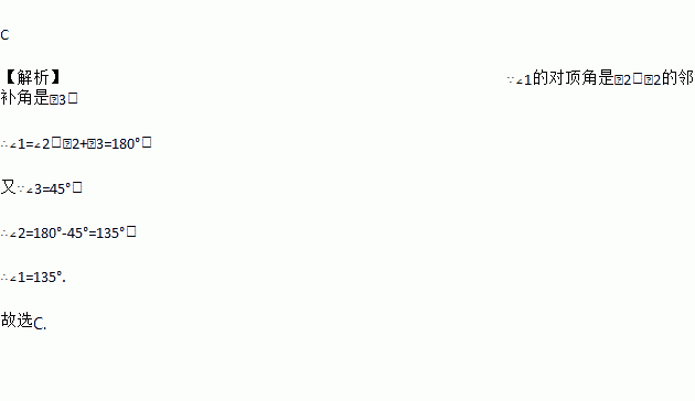 ∠1的对顶角是∠2,∠2的邻补角是∠3,若∠3=45°,则∠1的度数是( )