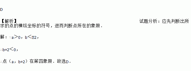 D 【解析】试题分析:应先判断出所求的点的横纵坐标的符号,进而判断点所在的象限. 【解析】 ∵a>0,b<﹣2, ∴b+2<0, ∴点(a,b+2)在第四象限.故选D.