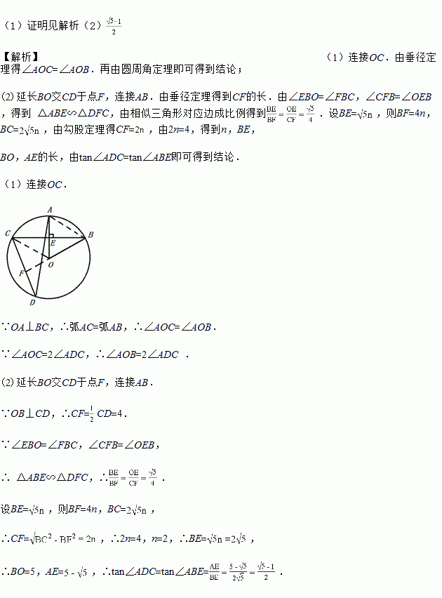 (2)若OB⊥CD,CD=8,OE=,求tan∠ADC.
