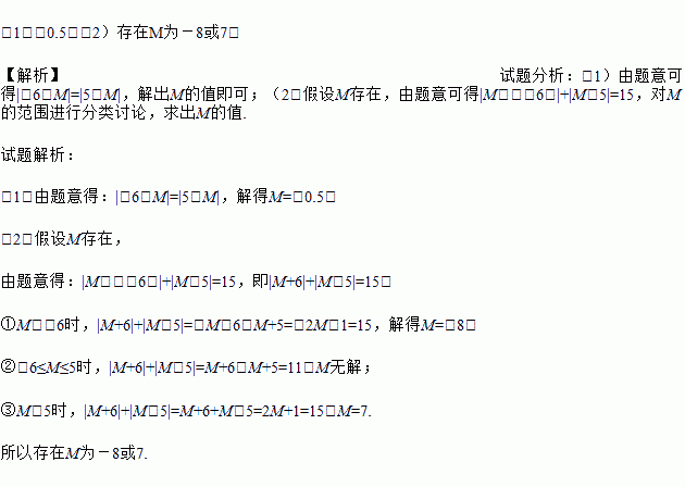 (1)-0.5;(2)存在M为-8或7. 【解析】试题分析:(1)由题意可得|-6-M|=|5-M|,解出M的值即可;(2)假设M存在,由题意可得|M-(-6)|+|M-5|=15,对M的范围进行分类讨论,求出M的值. 试题解析: (1)由题意得:|-6-M|=|5-M|,解得M=-0.5; (2)假设M存在, 由题意得:|M-(-6)|+|M-5|=15,即|M+6...