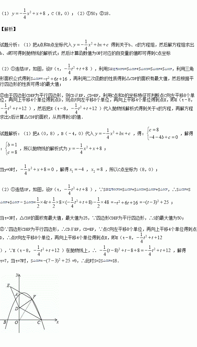 (2)点D的坐标为(0,4),点F为该二次函数在第一象限内图象上的动点,连接CD、CF,以CD、CF为邻边作平行四边形CDEF,设平行四边形CDEF的面积为S.