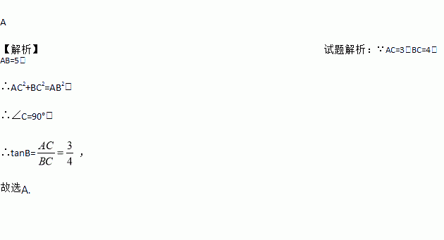 如图,在△ABC中,AC=3,BC=4,AB=5,则tanB的值是( )