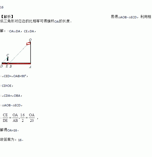 一天,小青想利用影子测量校园内一根旗杆的高度,在同一时刻内,小青的影长为2米,旗杆的影长为20米,若小青的身高为1.60米,则旗杆的高度为_____米.
