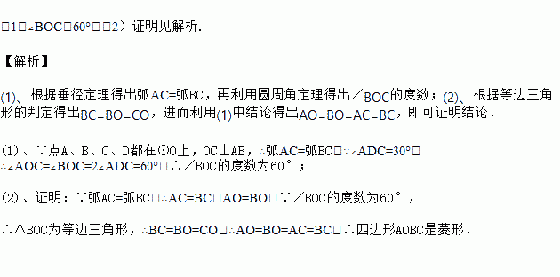 如图,点A,D,B,C都在⊙O上,OC⊥AB,∠ADC=30°.
