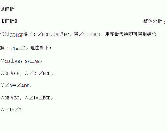 如图,CD⊥AB,GF⊥AB,∠B=∠ADE,试说明∠1与∠2的关系,并说明理由。
