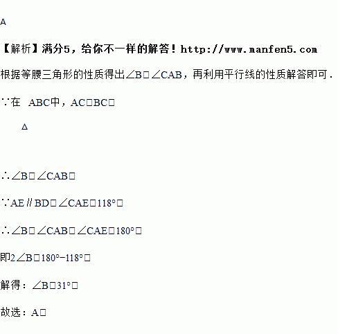 如图,在△ABC中,AC=BC,点D在BC的延长线上,AE∥BD,点ED在AC同侧,若∠CAE=118°,则∠B的大小为( )