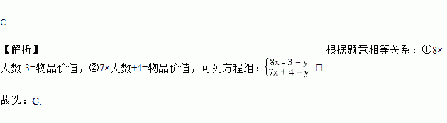 《九章算术》是中国古代第一部数学专著,它对我国古代后世的数学家产生了深远的影响,该书中记载了一个问题,大意是: 有几个人一起去买一件物品,每人出8 元,多3元; 每人出7 元,少4 元,问有多少人? 该物品价几何? 设有x人,物品价值y 元,则所列方程组正确的是( )