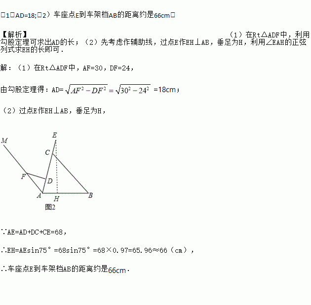 (1)AD=18;(2)车座点E到车架档AB的距离约是66cm. 【解析】(1)在Rt△ADF中,利用勾股定理可求出AD的长;(2)先考虑作辅助线,过点E作EH⊥AB,垂足为H,利用∠EAH的正弦列式求EH的长即可. 【解析】 (1)在Rt△ADF中,AF=30,DF=24, 由勾股定理得:AD==18cm; (2)过点E作EH⊥AB,垂足为H, ∵AE=AD+DC...
