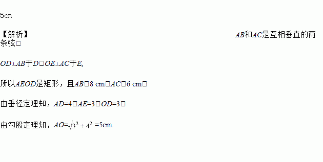 如图所示,在⊙O中,AB和AC是互相垂直的两条弦,OD⊥AB于D,OE⊥AC于E.且AB=8 cm,AC=6 cm,那么⊙O的半径OA的长为__________.