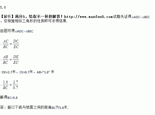 如图,阳光透过窗口照到室内,在地面上留下2.7米宽的亮区,已知亮区一边到窗下的墙脚距离CE=8.7米,窗口高AB=1.8 米,试求窗口下底与地面之间的距离BC的大小。