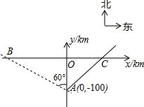 ÆøÏǫ́·¢²¼µÄÎÀÐÇÔÆÍ¼ÏÔʾ£¬Ä³Ì¨·çÔÚº£µºA±±Æ«Î÷60¡ã·½ÏòÉϵÄBµã´¦Éú³É£¬³ÇÊÐCÔÚº£µºA±±Æ«¶«45¡ãµÄ·½ÏòÉÏ£®½¨Á¢ÈçͼµÄÖ±½Ç×ø±êϵ£¬µãAλÓÚyÖáÉÏ£¬Ì¨·çÉú³É´¦BºÍ³ÇÊÐËùÔÚ´¦C¶¼ÔÚxÖáÉÏ£¬ÆäÖеãAµÄ×ø±êΪ£¨0£¬-100£©£®