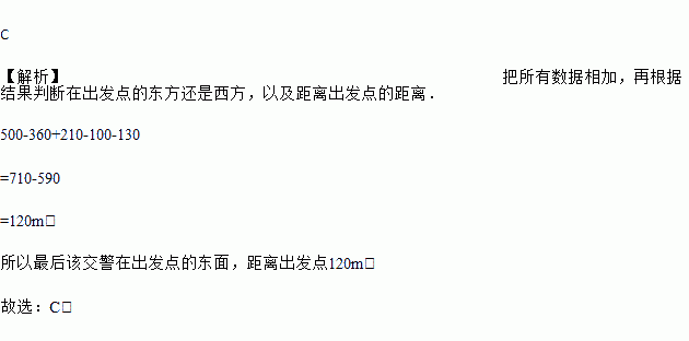 2018年春运期间,某省公安交管部门开展交通安全隐患大排查大整治活动,为减少司机违规驾驶,某交警在违规多发地段沿东西方向巡逻.若规定向东行走为正方向,该交警从出发点开始所走的路程(m)分别为500,-360,210,-100,-130,则最后该交警离出发点( )