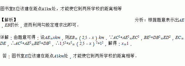 为了丰富少年儿童的业余生活,某社区要在如图中的AB所在的直线上建一图书室,本社区有两所学校所在的位置在点C和点D处,CA⊥AB于A,DB⊥AB于B.已知AB=2.5km,CA=1.5km,DB=1.Okm,试问:图书室E应该建在距点A多少km处,才能使它到两所学校的距离相等?