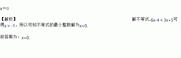 x=0 【解析】解不等式-6x-4<3x+5可得x>-1,所以可知不等式的最小整数解为x=0. 故答案为:x=0.