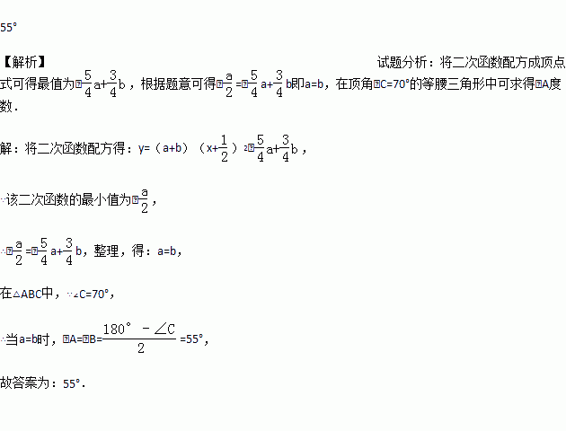 在△ABC中,∠A,∠B所对的边分别为a,b,∠C=70°.若二次函数y=(a+b)x ²+(a+b)x-(a-b)的最小值为-,则∠A=_________.