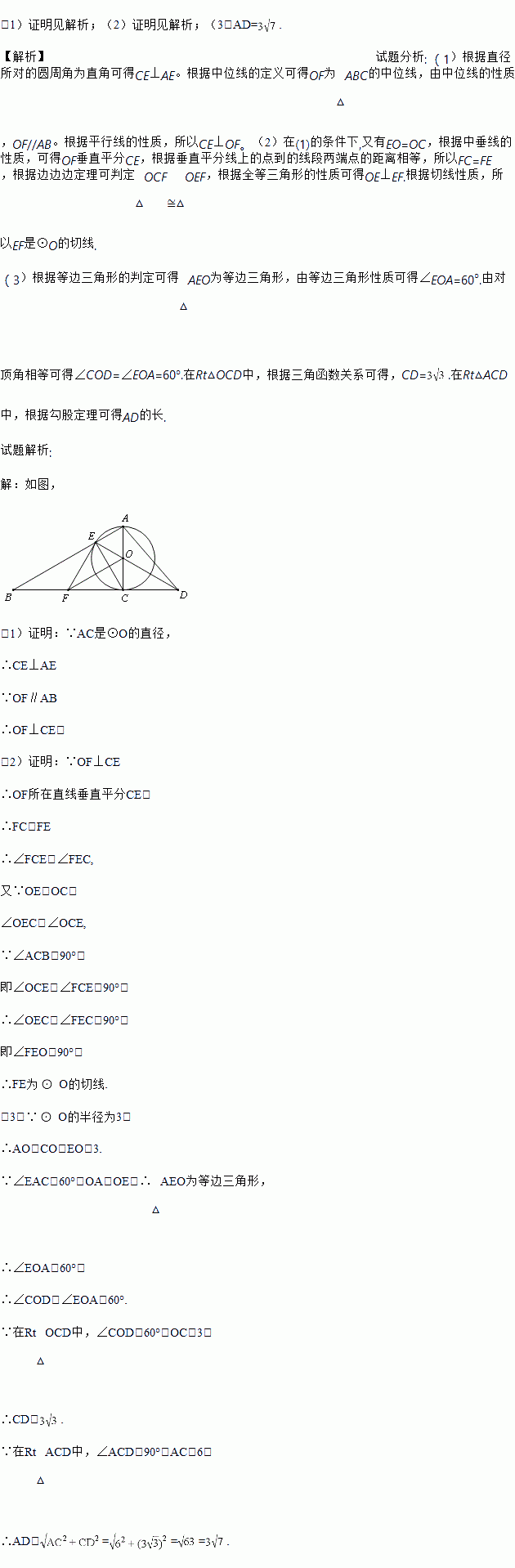 (3)若O的半径为3,∠EAC=60°,求AD的长.![]()