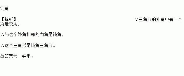 若三角形的外角中有一个是锐角,则这个三角形是________三角形.
