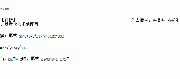 ﹣71. 【解析】先去括号,再合并同类项,最后代入求值即可. 【解析】 原式=2x2y+6xy2﹣3x2y+3﹣2x2y﹣2 =﹣3x2y+6xy2+1, 当x=﹣2,y=2时,原式=﹣24﹣48+1=﹣71.