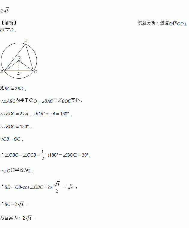如图,△ABC是⊙O的内接三角形,若⊙O的半径为2,∠BOC与∠A互补,则BC的长为________.