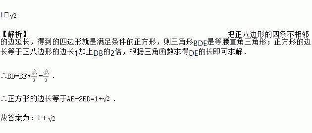 将一个边长为1的正八边形补成如图所示的正方形,这个正方形的边长等于________.(结果保留根号)