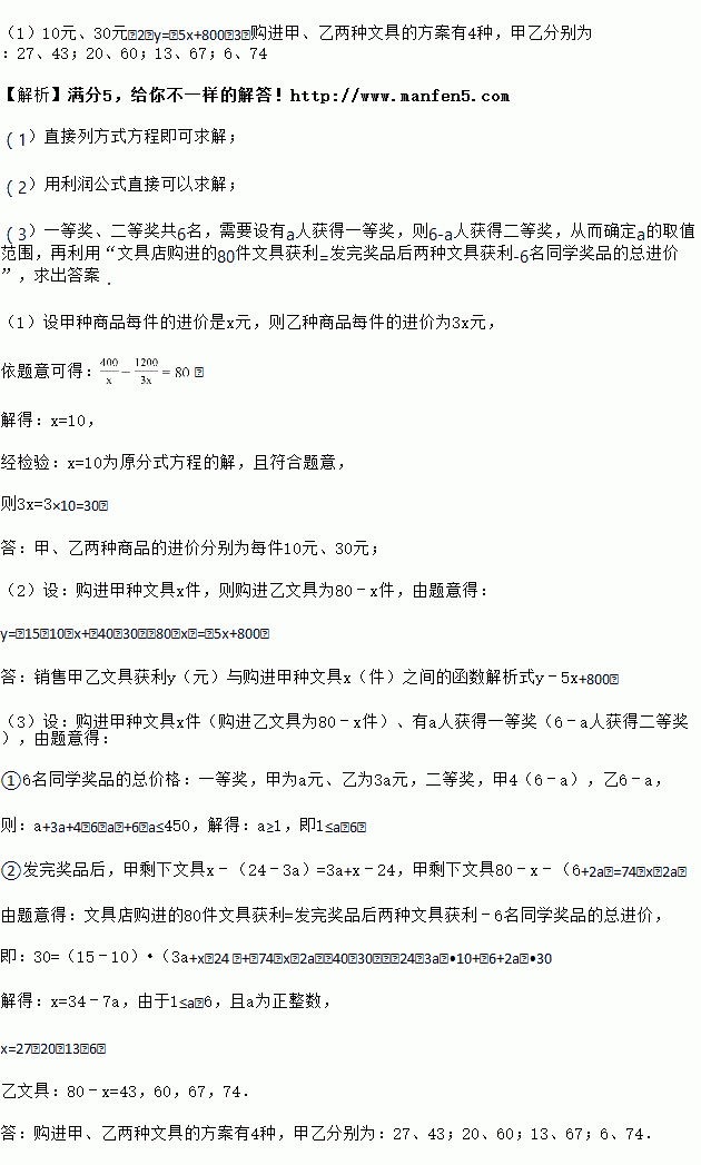 某文具店四月份购进甲、乙两种文具共80件,分别用去400元、1200元,甲种文具每件的进价是乙种文具的