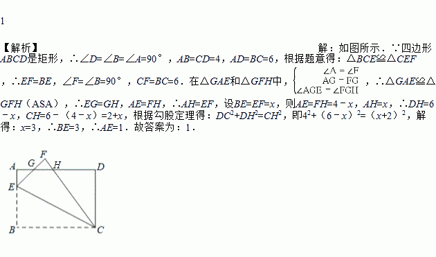 如图,矩形ABCD中,AB=4,BC=6,E为AB上一点,将△BCE沿CE翻折至△FCE,EF与AD相交于点G,且AG=FG,则线段AE的长为__________.