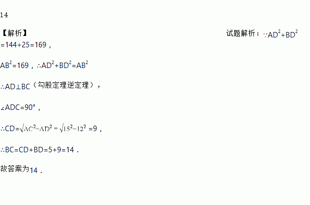 如图,D为△ABC的边BC上一点,已知 AB = 13,AD = 12,AC =15,BD=5,则BC的长为________.