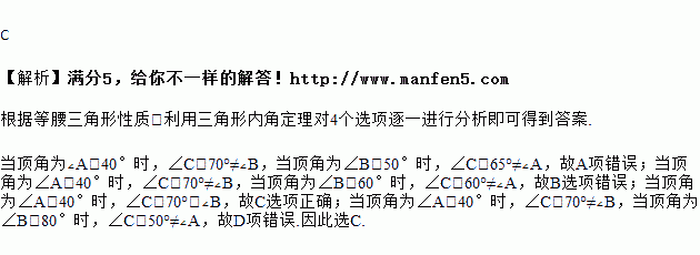 在△ABC中,其两个内角如下,则能判定△ABC为等腰三角形的是( )
