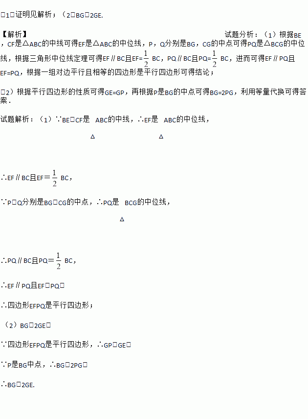如图,△ABC的中线BE,CF相交于点G,P、Q分别是BG、CG的中点.