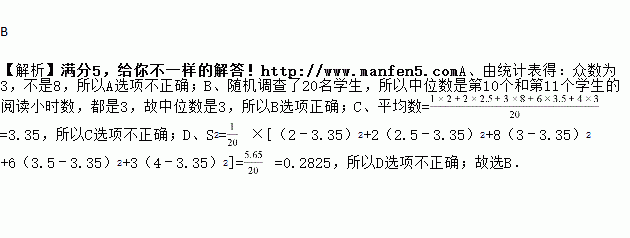 则关于这20名学生阅读小时数的说法正确的是( )