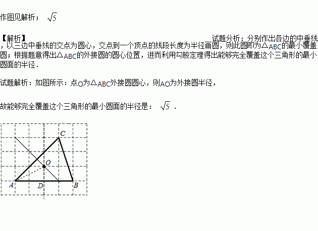 我们将能完全覆盖某平面图形的最小圆称为该平面图形的最小覆盖圆.如图,将△ABC放在每个小正方形边长为1的网格中,点A、B、C均落在格点上,作出△ABC的最小覆盖圆,并求出这个圆的半径.(保留作图痕迹)