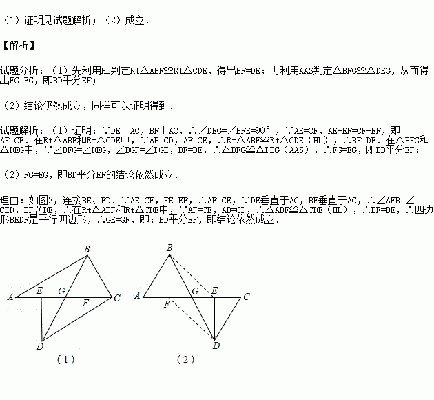 如图(1),A、E、F、C在一条直线上,AE=CF,过E、F分别作DE⊥AC,BF⊥AC,若AB=CD,试证明BD平分EF,若将△DEC的边EC沿AC方向移动变为图(2)时,其余条件不变,上述结论是否成立?请说明理由.
