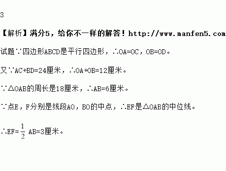 如图,ABCD的对角线AC,BD相交于点O,点E,F分别是线段AO,BO的中点,若AC+BD=24厘米,△OAB的周长是18厘米,则EF= 厘米.