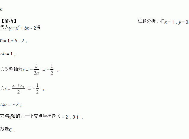 C 【解析】试题分析:把x=1,y=0代入y=x2+bx-2得: 0=1+b-2, ∴b=1, ∴对称轴为x==, ∴x==, ∴x2=-2, 它与x轴的另一个交点坐标是(-2,0). 故选C.
