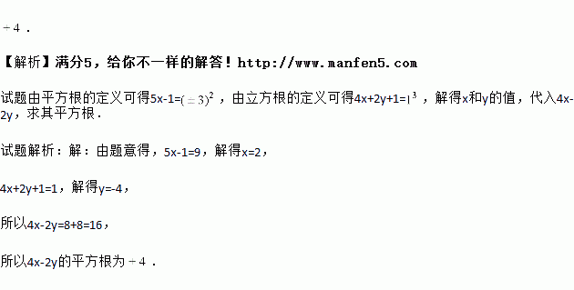 已知5x-1的算术平方根是3,4x+2y+1的立方根是1,求的值.![]()