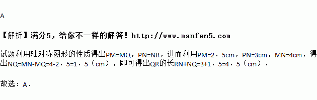 两边上的点,点P关于OA的对称点Q恰好落在线段MN上,点P关于OB的对称点R落在MN的延长线上![]()