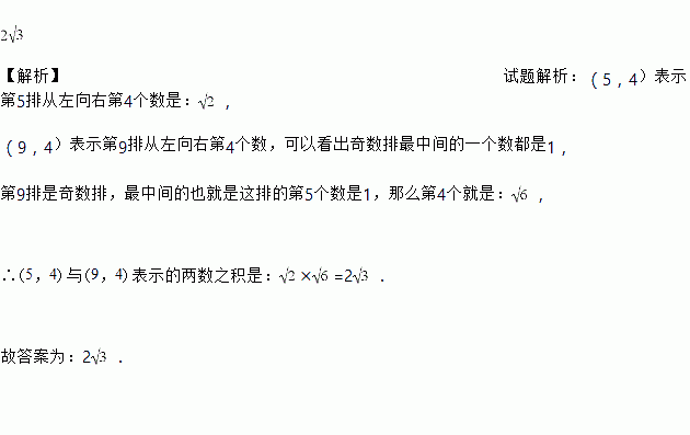 将1、、、按右侧方式排列.若规定(m,n)表示第m排从左向右第n个数,则(5,4)与(9,4)表示的两数之积是______.