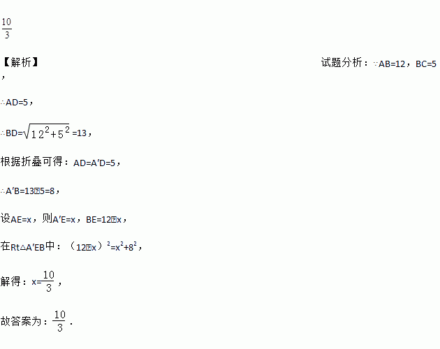 如图,在矩形纸片ABCD中,AB=12,BC=5,点E在AB上,将△DAE沿DE折叠,使点A落在对角线BD上的点A′处,则AE的长为_________.