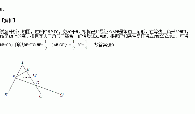 如图,过边长为1的等边△ABC的边AB上一点P,作PE⊥AC于E,Q为BC延长线上一点,当PA=CQ时,连PQ交AC边于D,则DE的长为 ( )