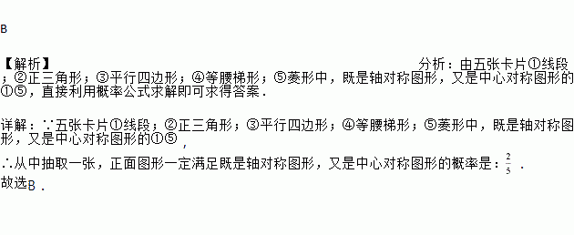 有五张卡片(形状、大小、质地都相同),上面分别画有下列图形:①线段;②正三角形;③平行四边形;④等腰梯形;⑤菱形,将卡片背面朝上洗匀,从中抽取一张,正面图形既是轴对称图形,又是中心对称图形的概率是( )