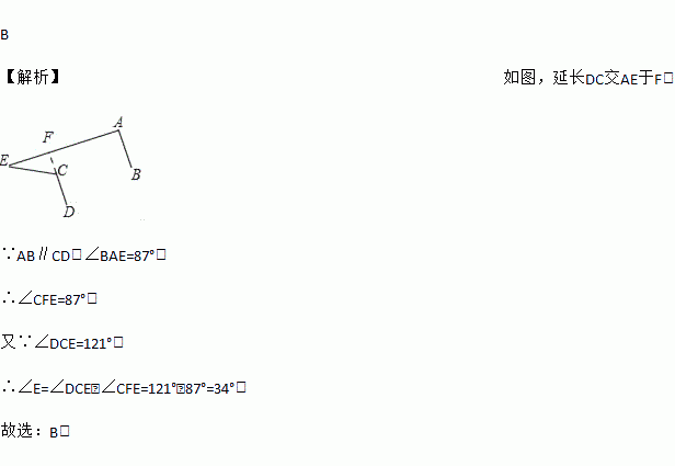 某同学在研究传统文化“抖空竹”时有一个发现:他把它抽象成数学问题,如图所示:已知AB∥CD,∠BAE=87°,∠DCE=121°,则∠E的度数是( )